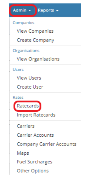 Select the Admin drop-down, then click on Ratecards. This will take you to the View Ratecards screen.