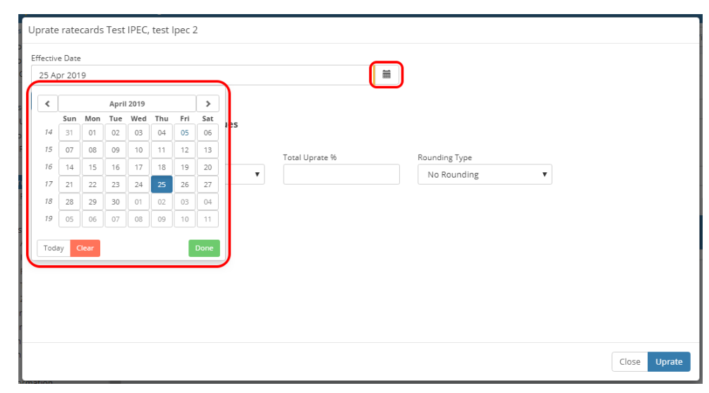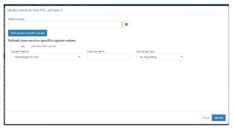 Once the ratecards have been selected, an Uprate modal will appear as below: