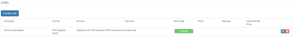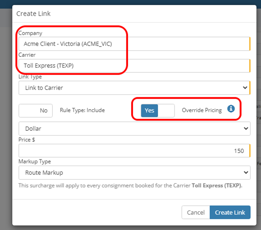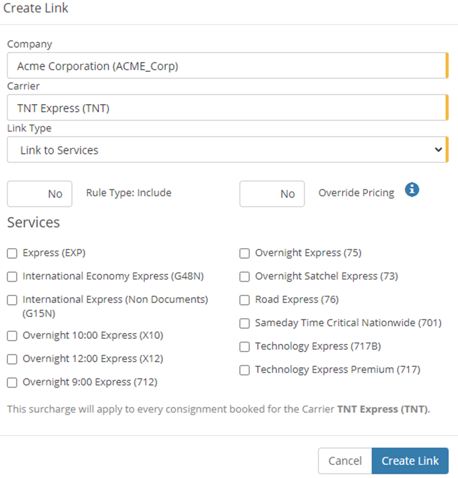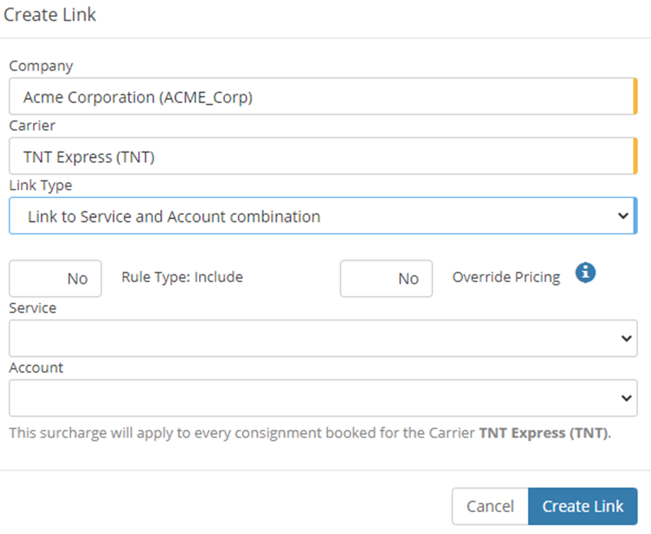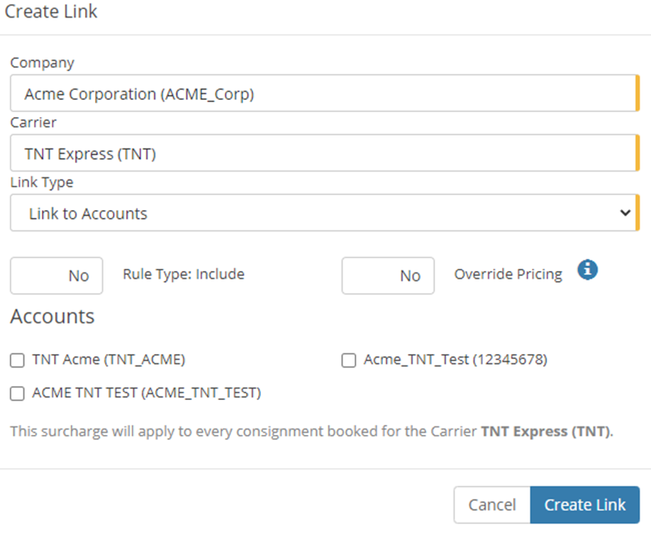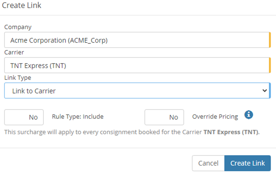 Once the carrier is selected, the default surcharges will be displayed below the link type. This will show the surcharges name and its default pricing.