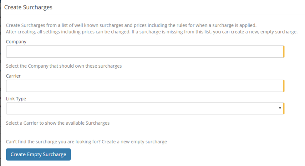 If you find that the surcharge you are looking to create is not on the defaults list then you are able to generate an Empty Surcharge. This is a surcharge which does not have a pre-defined logic query attached to it.