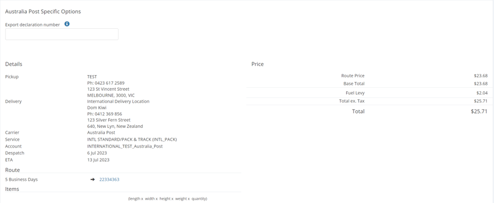 The Items Section will re-iterate the items which have been used to calculate the rate. If a piece rate (item based rate such as a pallet or carton rate) has been used then the type of rate used will be shown as the pricing item type.