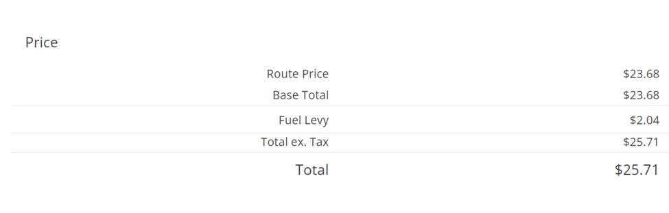 The price breakdown section will provide the component of pricing broken down by Base price (Route and Surcharges), Fuel Price, and Total.