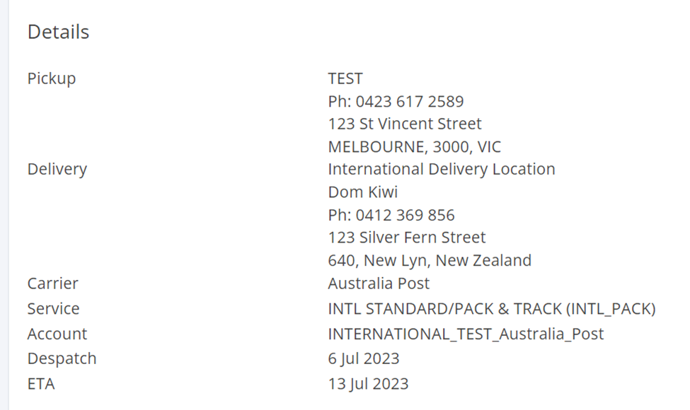 The Details section will reiterate the consignment pickup, delivery, carrier, service, account, despatch and ETA details for one last sanity check.