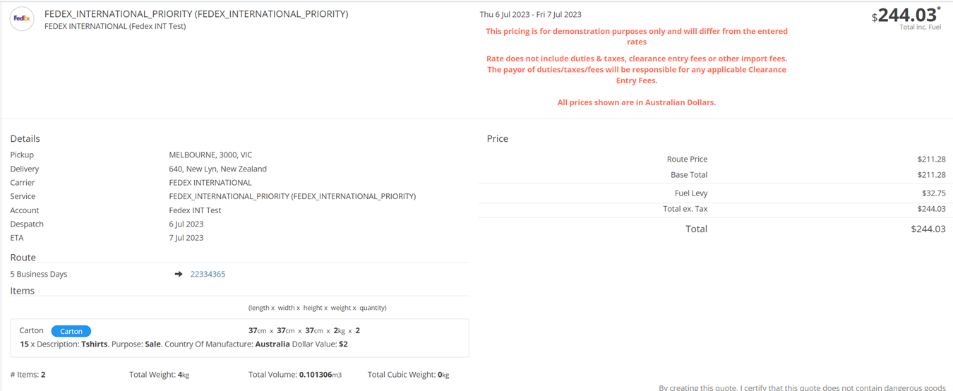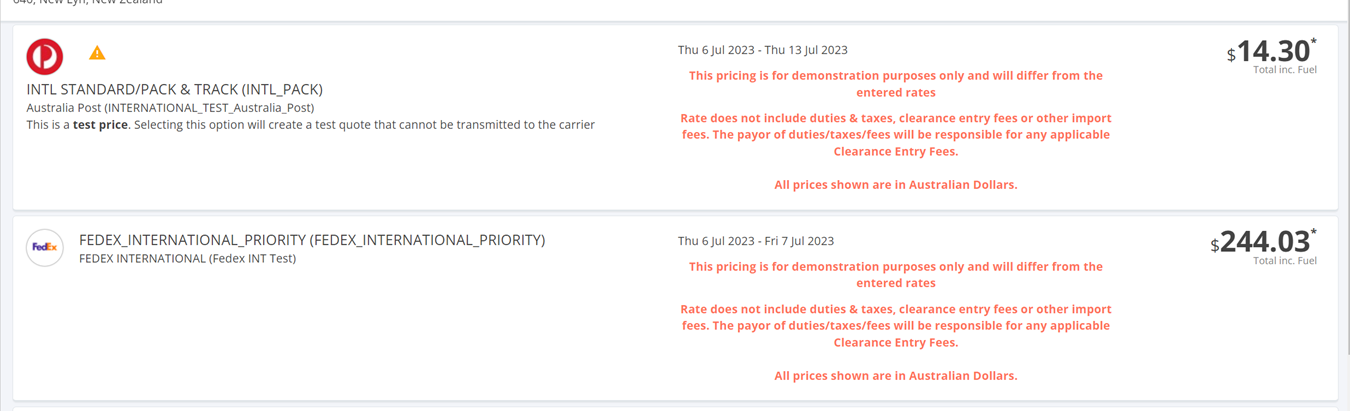 Each Carrier option will be returned with the ETA and the Price (inclusive fuel) on the carrier tile, as below.