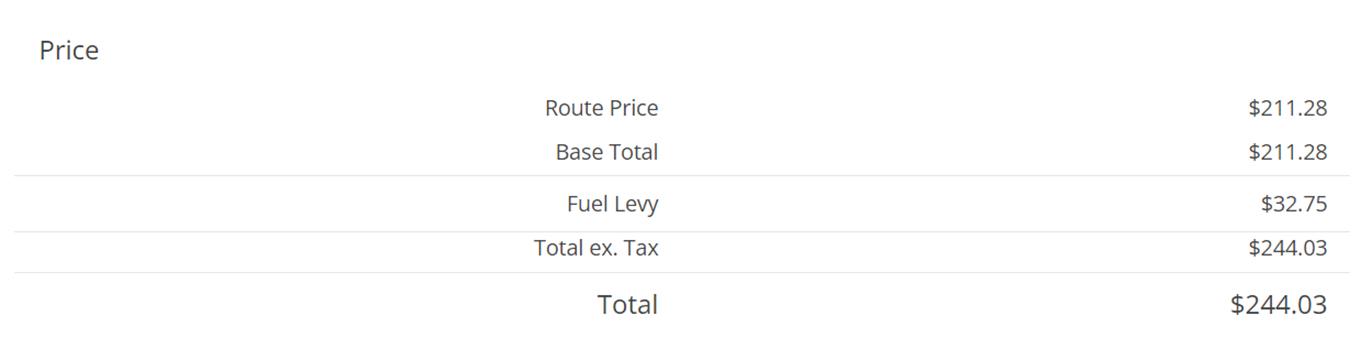 The price breakdown section will provide the pricing broken down by Base price (Route and Surcharges), Fuel Price, and Total.