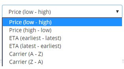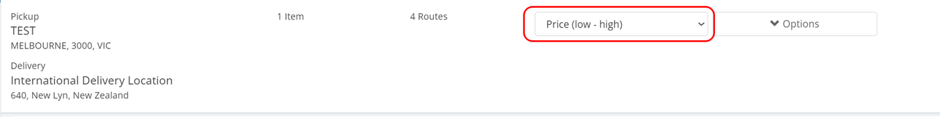 MachShip will return to you all of the available services that fit the From Suburb and To Suburb, Date, Time as well as Item size combination. This will be listed in the sort order which has been set against your company. The default will be Price (low to high). You can also adjust this order by picking from the drop-down along the summary bar.
