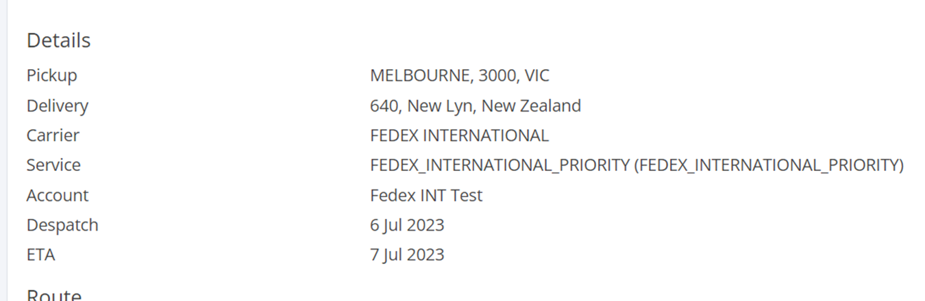 The Details section will reiterate the quotes, pickup, delivery, carrier, service, account, despatch and ETA details for one last sanity check.