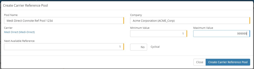 Reference Pools - Reference pools are utilized by MachShip in order to maintain a count on connote, manifest, and item numbers. The reference pool will ensure that each of those numbers is unique to what we previously sent to the carrier. More information can be obtained on reference pools here. Medi Direct requires the creation of just 1 reference pool for the Connote number.