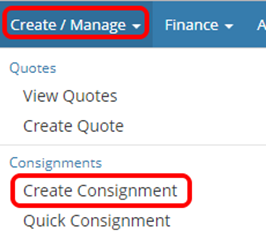 Navigate to Create / Manage drop-down, once the menu has opened, scroll down to the Consignment section and select Create Consignment.