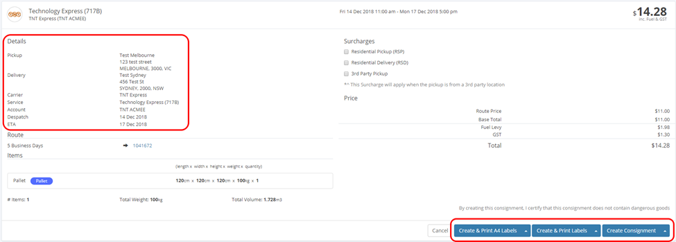 The Pickup Location and the Delivery Locations will have swapped around. From here you are able to edit a few details, however, if you do, you'll need to Generate a Route and select one. Click on any of the Create options to proceed to the next step.