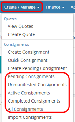 Navigate to the Create / Manage drop-down and select one of the following headings from the Consignments section: Pending Consignments, Unmanifested Consignments, Active Consignments, Completed Consignments or All Consignments.