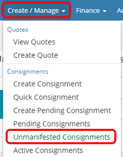 Navigate to the Create / Manage drop down. Scroll down to the Consignment section and select Unmanifested Consignments.