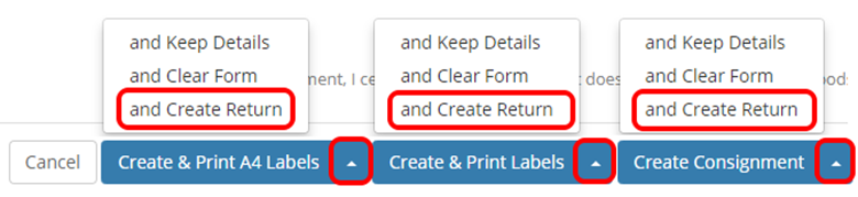 Create the consignment as per usual, fill in all of your details and click on Generate Route. Select a Route you would like to go ahead with. Before you go ahead and create the consignment, MachShip has provided a few options. If you click on the drop-up button on Create & Print A4 Labels, Create & Print Labels or Create Consignment, the menu will open up to show and Create Return.