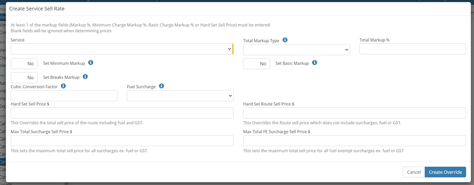 Should you wish to calculate the sell rates on a different cubic conversion factor or fuel surcharge to the cost rate calculation, you can set these in the service sell rate modal.