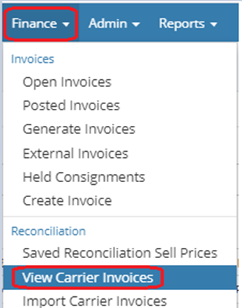 Navigate to Finance tab and click on View Carrier Invoices