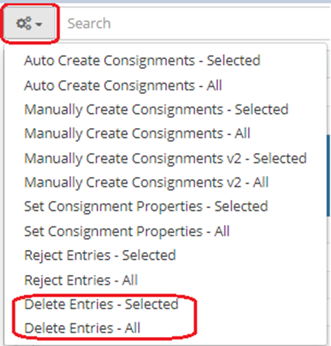 Click on the cog button beside the Search text box, and choose either Delete Entries - Selected or Delete Entries - All.