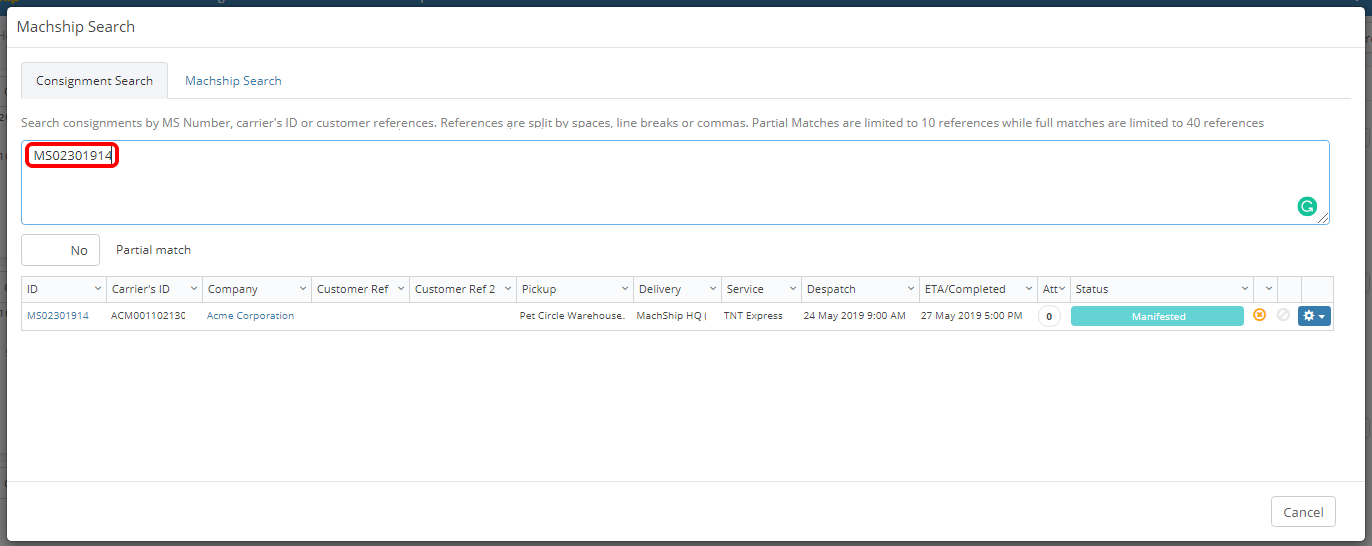In this MachShip Search modal, search consignments by MS Number, Carrier's ID or Customer References. References are split by spaces, line breaks or commas. Partial Matches are limited to 10 references while full matches are limited to 40 references.
