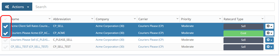 Once you have found the Ratecards whose rates you wish to export select them via the selection box on the left of the grid (as shown below):