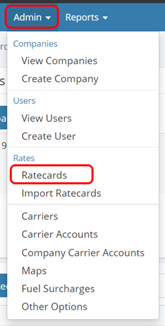 To start, navigate to the View Ratecards page. Select the Admin drop-down and click on Ratecards.