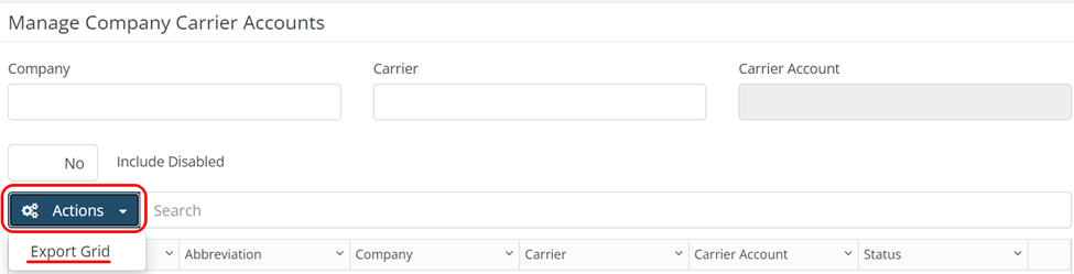 On the Manage Company Carrier Accounts page, click on the Actions drop-down button and click on the `Export Grid`.
