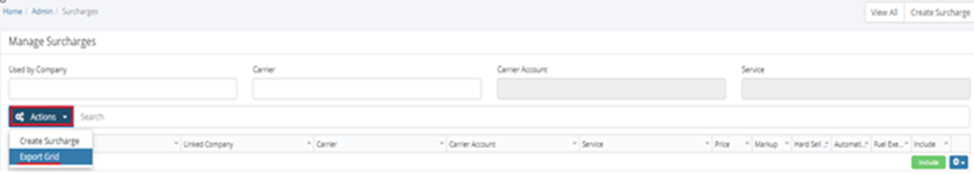 On the Manage Surcharges page, click on the Actions drop down button and click on the `Export Grid`.