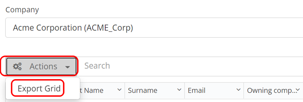 On the Users page, click on the Actions drop-down button and click on the `Export Grid`.