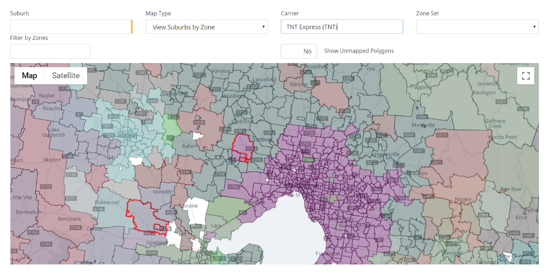 By first selecting the Carrier you will see the maps page show the applicable polygons and these will be colour coded based on the carrier zones. As below.