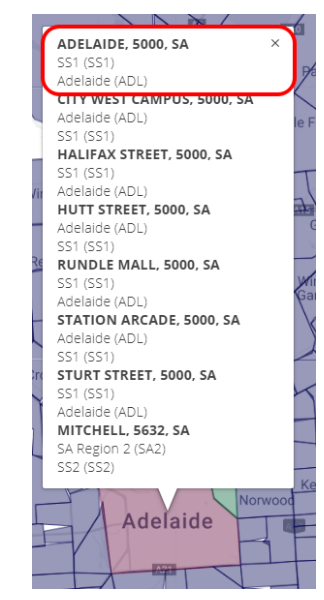 If you click on the polygon you will see a list of all the suburbs contained and what zones they have been mapped to. The zones are presented as Zone Name (Zone Abbreviation).