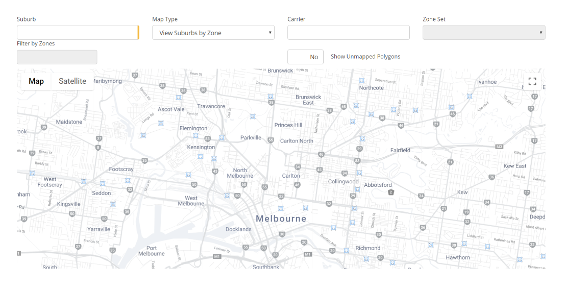 The maps page can be a good tool to use to ascertain what zones a single suburb is mapped to, but also to investigate pricing discrepancies or to troubleshoot why a route did not return.