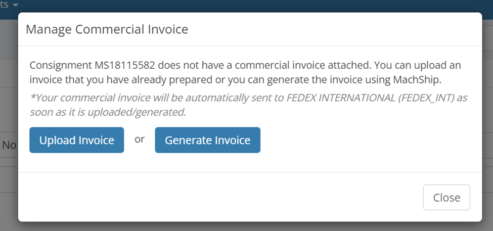 If you select generate Invoice MachShip will generate the invoice and (if applicable and setup) will print out the document or send it to the transport provider.