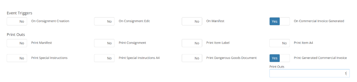 This would prompt one copy of the commercial invoice to be printed when the call is made to generate it.
