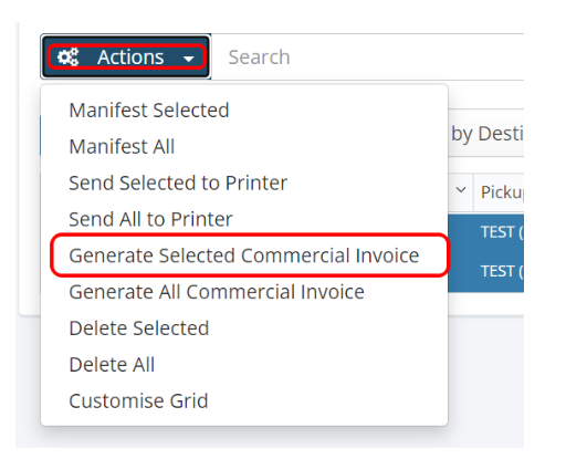 The selected rows will be highlighted, and you can then select the Actions drop-down and generate Selected Commercial Invoice.