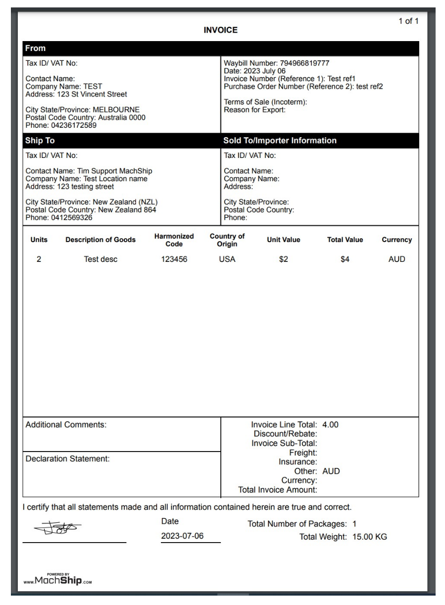 When generating the international consignment in MachShip, you will have been prompted to provide all the information needed to generate this document and pass it on to the transport provider.