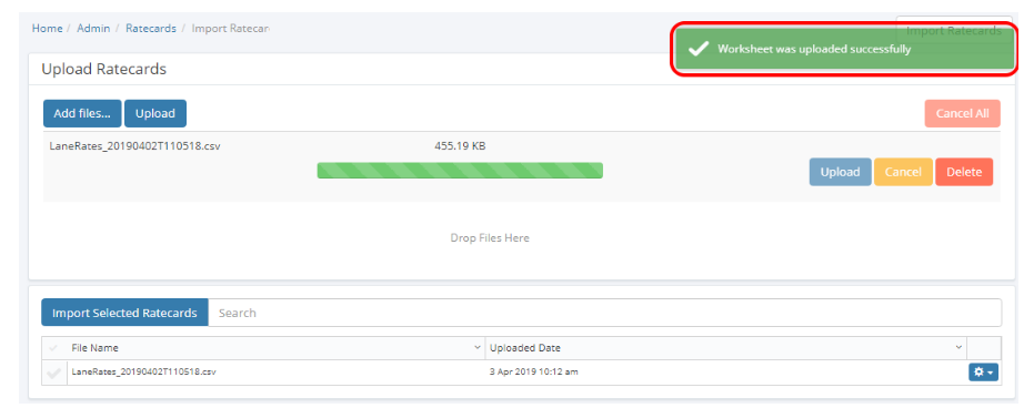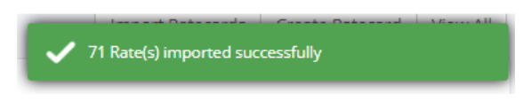 A green 'Ratecard(s) imported successfully' notification will show in the top right corner of the screen when the import was successful and the number of rates imported. The version will then be visible against the Ratecard in MachShip.