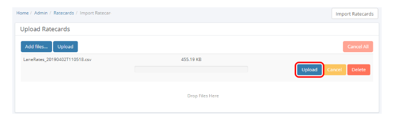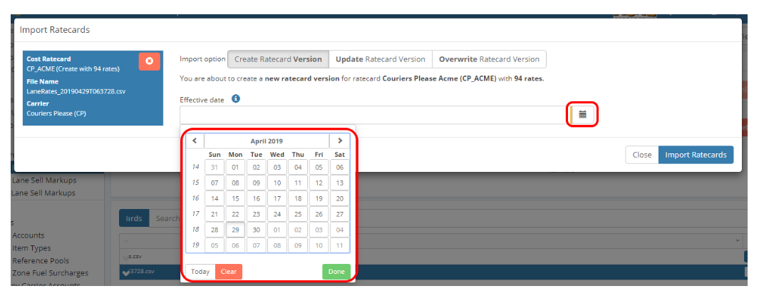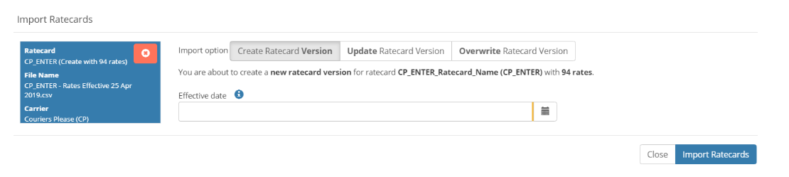 If you will be able to update or overwrite a Ratecard Version then the Import Ratecards Modal will appear as below: