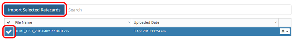 4. To import the file(s), select the file(s) by clicking on the tick which is located in the far left column. Then select Import Selected Ratecards.
