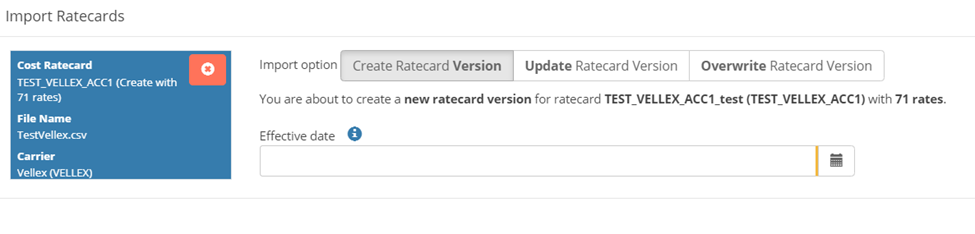 If the ratecard is to become active from a set date, provide the date in the Effective Date Field. If the Effective Date Field is left Blank, the new ratecard will become active as of 12:00 AM that day.