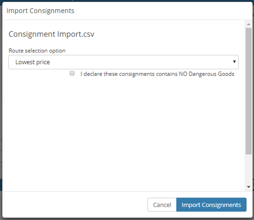 Once selected the Import Consignment Modal will appear. This will validate the file and then request you to select the Route Selection Option. Once complete, select Import Consignments.