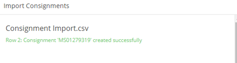 Once the import is complete MachShip will provide you with a list of successfully imported consignments or pending consignments and their relevant PC or MS numbers.