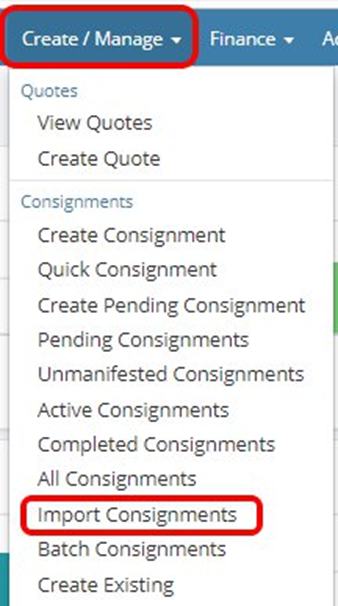 - To get to the Import Consignments screen, click Import Consignments under the Consignments section from the top menu Create/Manage.