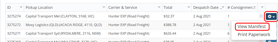 When you have found the correct Manifest, click on the drop-down Cog to show a few options. Click on View Manifest to proceed.