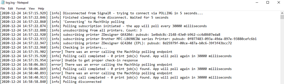 Any label print job that goes through the MachShip Printing Application will have each and every action recorded and saved for a period of time. If there are any issues with the running of the automated printing, we encourage that you obtain this data recording and provide through to support@machship.com. This will ensure that MachShip can provide the quickest possible solution.
