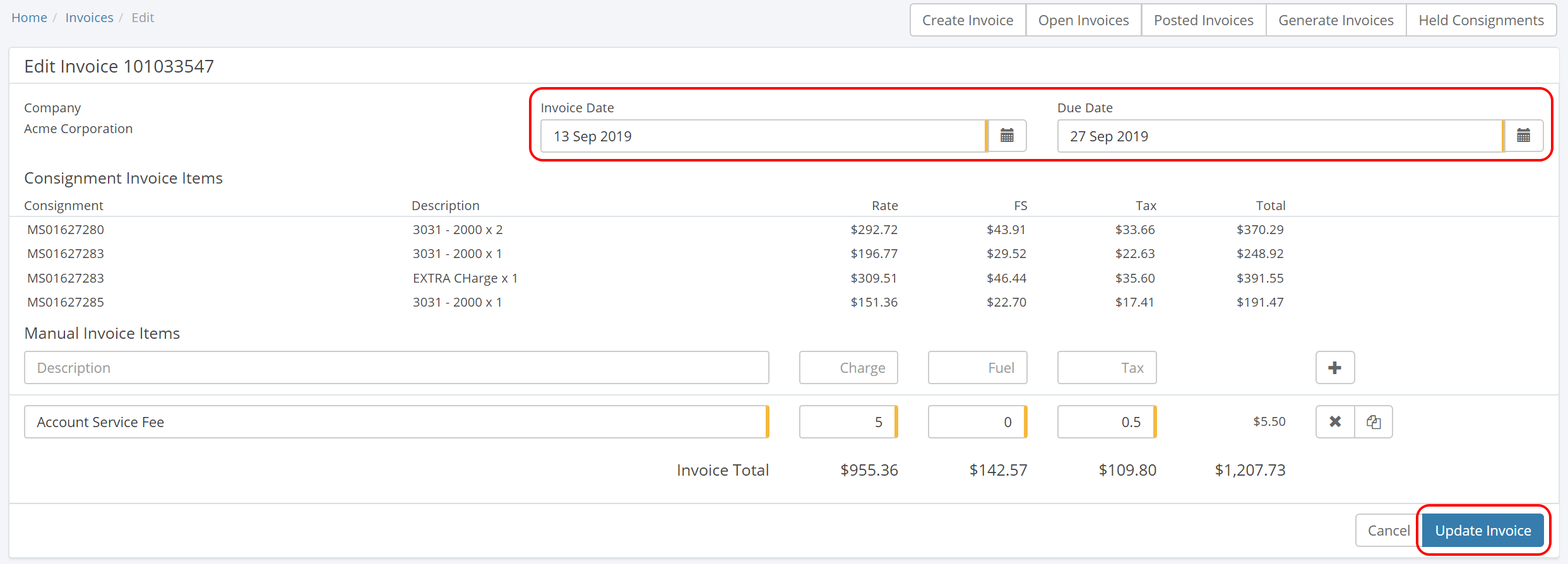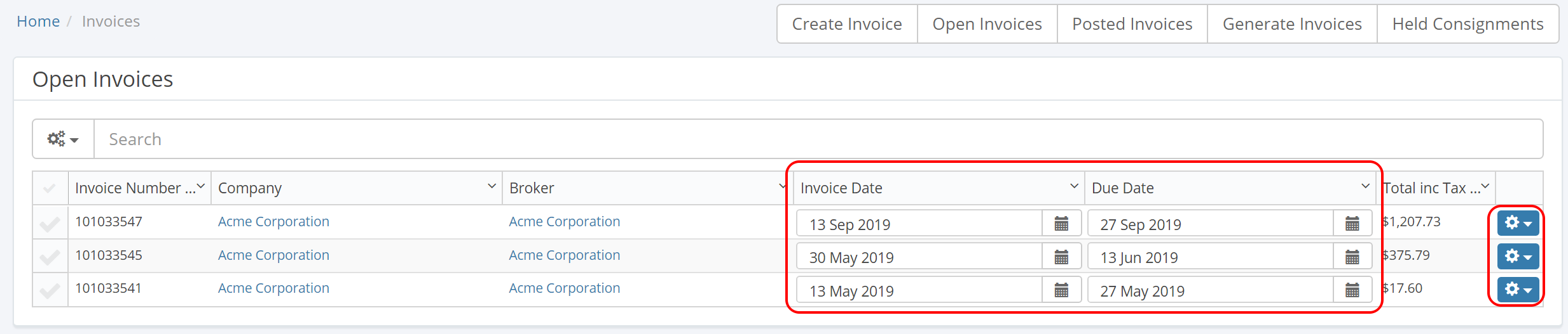 From this screen, you can edit the Invoice and Due Dates, if you are unsure what consignments are in these invoices you can click on the Cog to see a more detailed view.