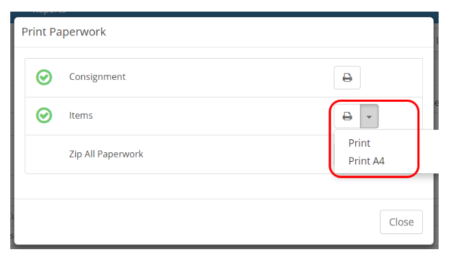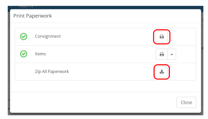 Clicking on the printer that is aligned with Consignments, which will download only the Consignment Note Document or by clicking on the download button next to Zip All Paperwork. This will download all the paperwork that this consignment has produced.