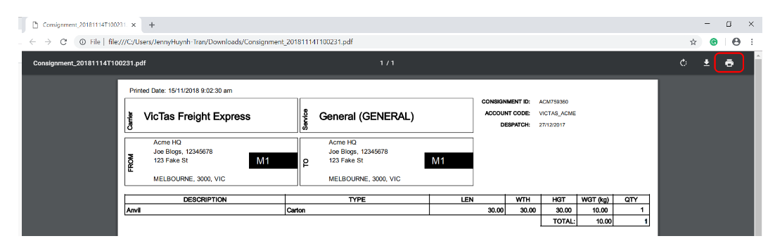 If you have selected to just print a Consignment, it will open in a separate window. From this screen, click on the printer that is showing in the top right corner of the screen, and from there follow the prompts.