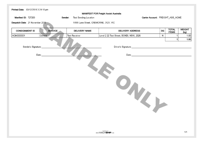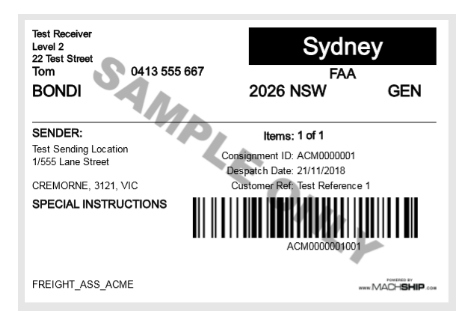 If you notice a SAMPLE ONLY watermark across your documents. This is due to using the wrong system. Please ensure you are in MachShip Live. Examples are below: