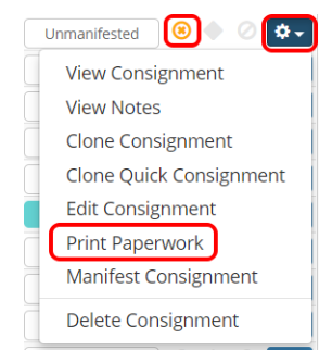 To get this prompt to appear, you can either click on the orange circle icon or the drop-down cog. This will reveal a list of actions. Select Print Paperwork to bring up the prompt.