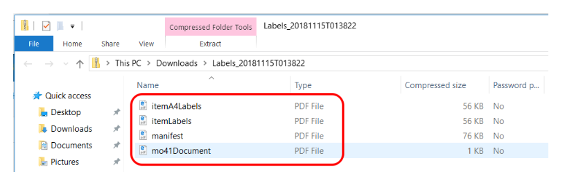 If you have selected to zip all labels then when unzipped the Zip file will open a folder with all of your documents, as seen in the image below. Double click on the label you would like to print and follow the prompts.
