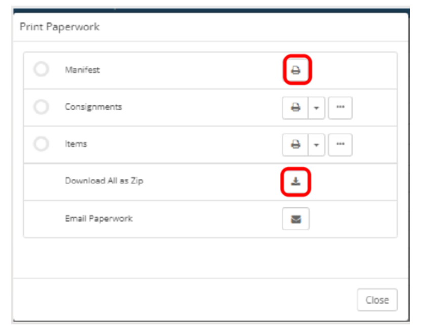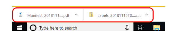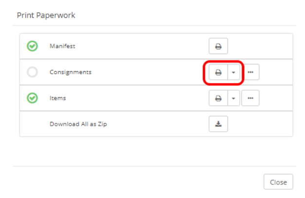 From here there are two ways you can obtain the Manifest Label. Clicking on the printer that is aligned with the word Manifest, this will download only the Manifest label or by clicking on the download button next to Download All as Zip, this will download all the paperwork that this consignment has produced.