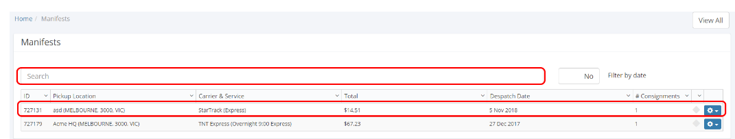 Use the search bar too if the manifest by using information such as ID, Carrier or by filtering the Date.